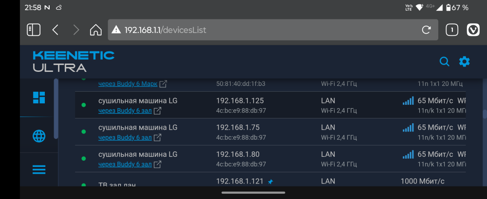 Видимо все же проблема на стороне роутера. Потому что после этих манипуляций в списке клиентов я все равно вижу 2 сушилки. И если "провалится" в одну из них, то ее адрес теперь .1.125, даже если я проваливаюсь в 1.75. Уже физически выключал из розетки и роутер и сушилку, роутер включил до сушилки. И один черт я вижу 2 устройства.