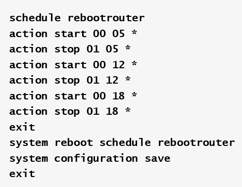 Мобильные операторы частенько постепенно занижают скорость, если модем долго подключен к Интернету. и постоянно приходиться передёргивать его в розетке перед началом рабочего дня, а то и после обеда. Для этого ипридумали такую функцию как РАСПИСАНИЕ. и как его легко настроить: Но многие хотят попросить разработчиков (особенно Я), прикрутить её к WEB-интерфейсу, в общих настройках например. Ведь для простого человека и такое не под силу, а надо. Я уже не говорю про редактирование дня недели, например при праздниках. Или перезагруки его в момент открытой БАЗЫ 1С, попробуй отредактируй. Ведь так же удобнее...