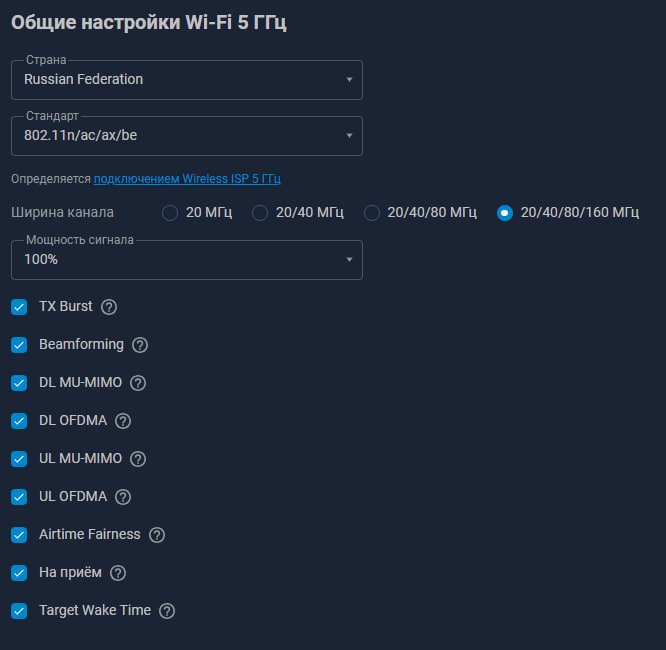 Вот ещё странная вещь😂 Включил всё по максимуму на 2.4 тоже (кроме мощности там 75%) и скорость стала стабильной. (до этого было выключено OFDMA DL/UL, на приём и Target Wake Time что по идее на стандарт AC влиять не должно). Но всё заработало, скорость держит стабильно.