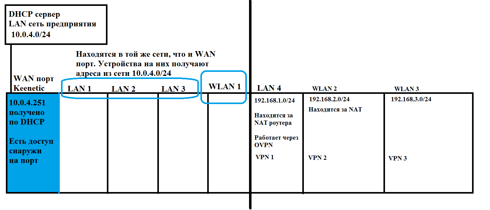 Есть сеть предприятия, имеем сетку 10.0.4.0/24, DHCP выдается сервером в этой сетке. Есть роутер ZyXEL Keenetic 4G III rev.A. Раньше он работал у меня в режиме точки доступа, начиная с какой то версии появилось отдельный режим такой, переключается в web интерфейсе и проблем с этим нет, понятно. В этом режиме отключается NAT, а так же отключается встроенный DHCP сервер. При этом трафик со всех портов работает как на обычном неуправляемом коммутаторе, LAN и WAN порт объединяются и работают все одинаково. Так же там поднимается Wi-Fi точка доступа, которая находится в одном сегменте с LAN портами и все устройства, которые подключаются к этой Wi-Fi сети, которую создает эта точка доступа получают ip адреса от DHCP сервера сети предприятия и могут обращаться к другим компьютерам в этой сети, а другие компьютеры могут обращаться к клиентам, которые подключены по воздуху без каких либо проблем. Тут всё просто, понятно и логично.