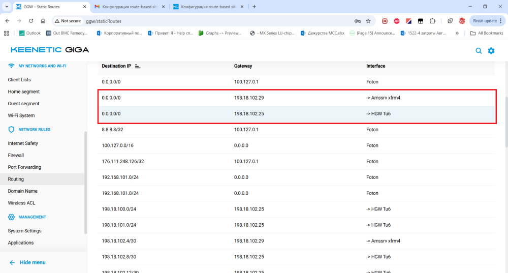 Так маршруты сами добавляются с помощью bird, для этого и поставлено. И тем более если нет маршрута, то трафик просто не пойдет в туннельный интерфейс, а не будет в нем играть в пинбол, пока TTL не закончится. А вот можете ответить, откуда берутся маршруты как на приложенной картинке, в то время как в CLI взгляд на это другой и на xfrm интерфейсы дефолт нигде не смотрит: ~ # ip route show table all | grep xfrm 198.18.100.0/24 via 198.18.102.25 dev nxfrm0 table 74 proto bird metric 32 198.18.101.0/24 via 198.18.102.25 dev nxfrm0 table 74 proto bird metric 32 198.18.102.4/30 via 198.18.102.29 dev nxfrm1 table 74 proto bird metric 32 198.18.102.8/30 via 198.18.102.25 dev nxfrm0 table 74 proto bird metric 32 198.18.102.12/30 via 198.18.102.25 dev nxfrm0 table 74 proto bird metric 32 198.18.102.16/30 via 198.18.102.29 dev nxfrm1 table 74 proto bird metric 32 198.18.102.20/30 via 198.18.102.29 dev nxfrm1 table 74 proto bird metric 32 198.18.102.24/30 dev nxfrm0 table 74 proto kernel scope link 198.18.102.24/30 dev nxfrm0 table 74 proto bird scope link metric 32 198.18.102.28/30 dev nxfrm1 table 74 proto kernel scope link 198.18.102.28/30 dev nxfrm1 table 74 proto bird scope link metric 32 198.18.102.32/30 via 198.18.102.29 dev nxfrm1 table 74 proto bird metric 32 198.18.102.64/27 via 198.18.102.29 dev nxfrm1 table 74 proto bird metric 32 198.18.102.96/27 via 198.18.102.29 dev nxfrm1 table 74 proto bird metric 32 198.18.102.128/28 via 198.18.102.29 dev nxfrm1 table 74 proto bird metric 32 198.18.102.255 via 198.18.102.29 dev nxfrm1 table 74 proto bird metric 32 198.18.200.0/24 via 198.18.102.25 dev nxfrm0 table 74 proto bird metric 32 198.18.255.1 via 198.18.102.25 dev nxfrm0 table 74 proto bird metric 32 198.18.255.2 via 198.18.102.29 dev nxfrm1 table 74 proto bird metric 32 198.18.255.3 via 198.18.102.29 dev nxfrm1 table 74 proto bird metric 32 198.18.255.4 via 198.18.102.25 dev nxfrm0 table 74 proto bird metric 32 198.18.100.0/24 via 198.18.102.25 dev nxfrm0 proto bird metric 32 198.18.101.0/24 via 198.18.102.25 dev nxfrm0 proto bird metric 32 nexthop via 198.18.102.25 dev nxfrm0 weight 1 nexthop via 198.18.102.29 dev nxfrm1 weight 1 198.18.102.4/30 via 198.18.102.29 dev nxfrm1 proto bird metric 32 198.18.102.8/30 via 198.18.102.25 dev nxfrm0 proto bird metric 32 198.18.102.12/30 via 198.18.102.25 dev nxfrm0 proto bird metric 32 198.18.102.16/30 via 198.18.102.29 dev nxfrm1 proto bird metric 32 198.18.102.20/30 via 198.18.102.29 dev nxfrm1 proto bird metric 32 198.18.102.24/30 dev nxfrm0 proto kernel scope link src 198.18.102.26 198.18.102.24/30 dev nxfrm0 proto bird scope link metric 32 198.18.102.28/30 dev nxfrm1 proto kernel scope link src 198.18.102.30 198.18.102.28/30 dev nxfrm1 proto bird scope link metric 32 198.18.102.32/30 via 198.18.102.29 dev nxfrm1 proto bird metric 32 198.18.102.64/27 via 198.18.102.29 dev nxfrm1 proto bird metric 32 198.18.102.96/27 via 198.18.102.29 dev nxfrm1 proto bird metric 32 198.18.102.128/28 via 198.18.102.29 dev nxfrm1 proto bird metric 32 198.18.102.255 via 198.18.102.29 dev nxfrm1 proto bird metric 32 198.18.200.0/24 via 198.18.102.25 dev nxfrm0 proto bird metric 32 198.18.255.1 via 198.18.102.25 dev nxfrm0 proto bird metric 32 198.18.255.2 via 198.18.102.29 dev nxfrm1 proto bird metric 32 198.18.255.3 via 198.18.102.29 dev nxfrm1 proto bird metric 32 198.18.255.4 via 198.18.102.25 dev nxfrm0 proto bird metric 32 broadcast 198.18.102.24 dev nxfrm0 table local proto kernel scope link src 198.18.102.26 local 198.18.102.26 dev nxfrm0 table local proto kernel scope host src 198.18.102.26 broadcast 198.18.102.27 dev nxfrm0 table local proto kernel scope link src 198.18.102.26 broadcast 198.18.102.28 dev nxfrm1 table local proto kernel scope link src 198.18.102.30 local 198.18.102.30 dev nxfrm1 table local proto kernel scope host src 198.18.102.30 broadcast 198.18.102.31 dev nxfrm1 table local proto kernel scope link src 198.18.102.30 local 198.18.102.34 dev nxfrm2 table local proto kernel scope host src 198.18.102.34 fe80::/64 dev xfrms1 proto kernel metric 256 pref medium fe80::/64 dev xfrms2 proto kernel metric 256 pref medium fe80::/64 dev nxfrm0 proto kernel metric 256 pref medium fe80::/64 dev nxfrm1 proto kernel metric 256 pref medium ff00::/8 dev xfrms1 table local proto kernel metric 256 pref medium ff00::/8 dev xfrms2 table local proto kernel metric 256 pref medium ff00::/8 dev nxfrm0 table local proto kernel metric 256 pref medium ff00::/8 dev nxfrm1 table local proto kernel metric 256 pref medium Пока рабочая гипотеза следующая: не может где-то использоваться какая-нибудь фича strongswan, которая вставляет маршрут на сеть, которая предназначена для шифрования, в xfrm интерфейс? Для routed IPSec VPN это очевидно со всех сторон 0.0.0.0/0, поскольку контроль за направлением в туннель трафиком возложен на протоколы маршрутизации. Поэтому если автоматически вставлять дефолты, то может наблюдаться как раз ситуация с закольцовыванием и блэкхолингом приходящего извне трафика.