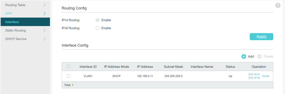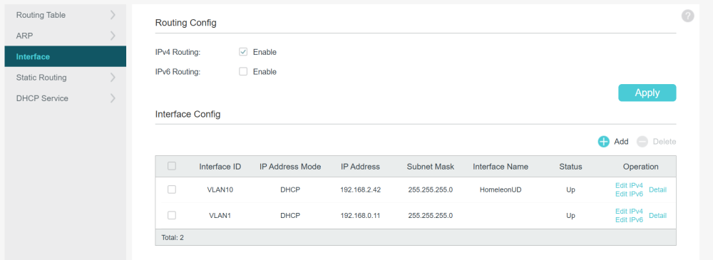 4. Со скринами выложу что сделал, чтобы проще было увидеть, где я накосячил.) Контроллер. Домашняя сеть. Сегмент HomeleonUD Настройки коммутатора. Напомню, контроллер Ultra подключен в 9 порта коммутатора. Рестрансляторы в 10 и 12 порт коммутатора. vlan 1 по умолчанию который vlan 10 Есть еще одна настройка на коммутаторе, вот скрины. Тут отображается только vlan 1 Но если я залезу в interface и там добавлю То в routing table отобразится следующее Однако все это не помогает получить ip с ретранслятора