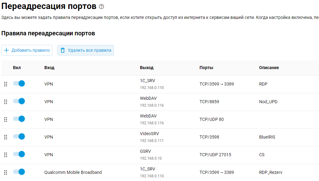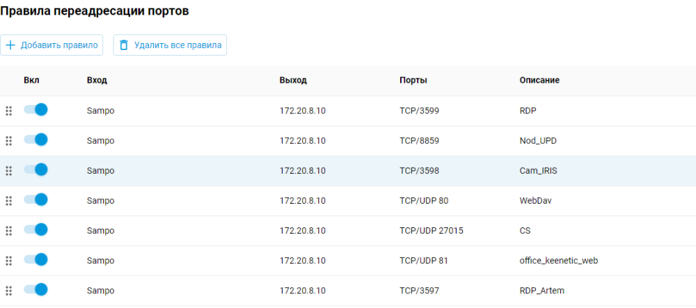1. Ситуация следующая: Имеется два одинаковых роутера Viva (KN-1912) EAEU. Роутер1 имеет белый ip адрес к нему подключается Роутер2 через IKEV2/IPSEC. Роутеру2 выдается всегда один статический адрес Роутером1 172.20.8.10. На Роутер1 настроены пробросы портов на Роутер 2 (RDP, Web, еще несколько служебных портов). Устройства сидящие за Роутер2 пользуются интернетом Роутер1. У Роутер2 есть резервный канал - модем. Настройки приоритетов подключения Роутер2: 1. VPN 2. Модем 3. Провайдер. Настройки пробросов прикрепил. Проблема обнаружилась 19 ноября, когда не смогли удаленно подключиться по белому IP к серверу, находящемуся за Роутер2 по RDP. Правила такие: Роутер1 принимает соединение по белому IP на порт 3599, пробрасывает на порт 3599 Роутер2. Роутер2 принимает подключение на порту 3599 и пробрасывает его на порт 3389 (стандартный порт RDP). Соединение не проходит. При том через подключение по резервному каналу напрямую к Роутер2 проходит. Соответственно престали работать все пробросы портов между Роутер1 и Роутер2. При том порт web интерфейса Роутер2 - 81 проброшен через Роутер1 (подключаясь по белому ip на порт 81 попадаю в web интерфейс Роутер2). Если я подключаюсь по белому IP на Роутер1 по порту 81, то попадаю на Роутер2. Т.е. проброс порта web управления работает. Экспериментируя, поменял порт управления Роутер2 на 777 - при подключении через белый IP попал на порт управления Роутер2, как и ожидалось. Насквозь пробросил этот порт серверу за Роутер2 (Роутер 1 пробрасывает 777-777, Роутер2 777-3598) - не работает. Повторюсь - проблема пявилась только 19 ноября, до этого все пробросы работали корректно. Знаю, что плюс/минус в это время все роутеры keenetic обновлялись принудительно. Не могут ли эти события быть связаны? Прошу помощи.