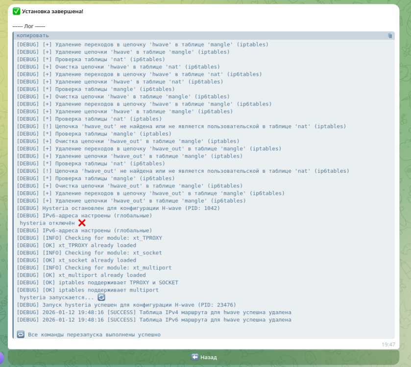 Установка и настройка Hysteria 2 на роутерах Keenetic Установка и настройка Hysteria 2 на роутерах Keenetic с использованием Entware и проекта H-wave. Требования Роутер Keenetic с поддержкой USB Внешний USB-накопитель Установленный Entware Доступ к роутеру по SSH Установка Entware Перед установкой Hysteria 2 необходимо подготовить USB-накопитель и установить Entware. 📘 Официальная инструкция Keenetic: 👉 https://help.keenetic.ru/hc/ru/articles/360021214160.html Включение необходимых компонентов Для корректной работы требуются модули ядра Netfilter: xt_TPROXY xt_socket xt_multiport Как включить В веб-интерфейсе Keenetic: Управление → Параметры системы → Общие настройки системы→ Изменить набор компонентов → Пакеты OPKG Включите компонент: Модули ядра подсистемы Netfilter Перезагрузите роутер при необходимости. Обновление Entware и установка зависимостей Подключитесь к роутеру по SSH и выполните: opkg update opkg install wget-ssl ca-certificates Установка Hysteria 2 Hysteria 2 устанавливается напрямую из релизов GitHub. Для архитектуры mipsle: opkg install https://github.com/for6to9si/H-wave/releases/download/v2.6.5/hysteria_2.6.5_mipsle.ipk Для архитектуры arm64: opkg install https://github.com/for6to9si/H-wave/releases/download/v2.6.5/hysteria_2.6.5_arm64.ipk ℹ️ Если архитектура роутера неизвестна, можно попробовать установить оба пакета — Entware не позволит установить неподходящий. ⚠️ Версия arm64 не тестировалась автором. Удаление Hysteria 2 Удаление пакета Hysteria из списка opkg влечет за собой удаление связанной с ним политики доступа Hwave на роутере keenetic opkg remove hysteria-tg-installer Конфигурация Hysteria Далее необходимо внести настройки в файл конфигурации Hysteria: Пример файла конфигурации можно найти здесь: /opt/etc/hysteria/config.json Список команд /opt/etc/init.d/S96hysteria status — узнать текущий статус /opt/etc/init.d/S96hysteria restart — перезапуск Hysteria (включает запуск Hysteria и применение настроек маршрутизации) /opt/etc/init.d/S96hysteria fast_restart — быстрый перезапуск Hysteria (маршрутизация не затрагивается) /opt/etc/init.d/S96hysteria firewall_up — запуск / применение настроек маршрутизации /opt/etc/init.d/S96hysteria stop — остановка Hysteria и отключение маршрутизации Логи и отладка Просмотр логов Hysteria Просмотр логов Hysteria и другая полезная отладочная информация: cat /opt/var/log/hwave/hwave.log Режим отладки По умолчанию включён полный режим отладки. Для отключения отладочного вывода установите переменную DEBUG=false в файле /opt/etc/init.d/S96hysteria. Важное замечание о Obfuscation Включение Obfuscation (см. документацию: https://v2.hysteria.network/docs/advanced/Full-Client-Config/?h=obfuscation#obfuscation) приводит к неработоспособности Hysteria на сотовых операторах. Причина: операторы распознают пакеты как непонятный UDP-трафик и дропают их. Лучше отключить маскировку, и настройть работу Hysteria на работу quic Решения для работы с QUIC Вариант 1: Бесплатный домен и сертификат Зарегистрировать домен 3-го уровня на сайте: freedns.afraid.org Автоматически получить TLS-сертификат с помощью встроенного ACME-клиента Hysteria Документация: https://v2.hysteria.network/docs/getting-started/Server/?h=acme#__tabbed_1_1 Вариант 2: Свой домен и платный сертификат Использовать свой домен Применить купленный TLS-сертификат Быстрый взгляд на Hysteria Чистая Hysteria имеет ряд преимуществ перед встроенным пакетом Hysteria в программе sing-box. Основные преимущества Поддержка опции медленной загрузки 👉 https://v2.hysteria.network/docs/advanced/Full-Client-Config/?h=lazy#lazy Поддержка опции быстрого подключения 👉 https://v2.hysteria.network/docs/advanced/Full-Client-Config/?h=fast+open#fast-open Особенности работы Соединение по UDP может держаться почти 2 часа в открытом состоянии без повторного обмена ключами. Также можно изменять размер пакета QUIC: 👉 https://v2.hysteria.network/docs/advanced/Full-Client-Config/?h=quic+