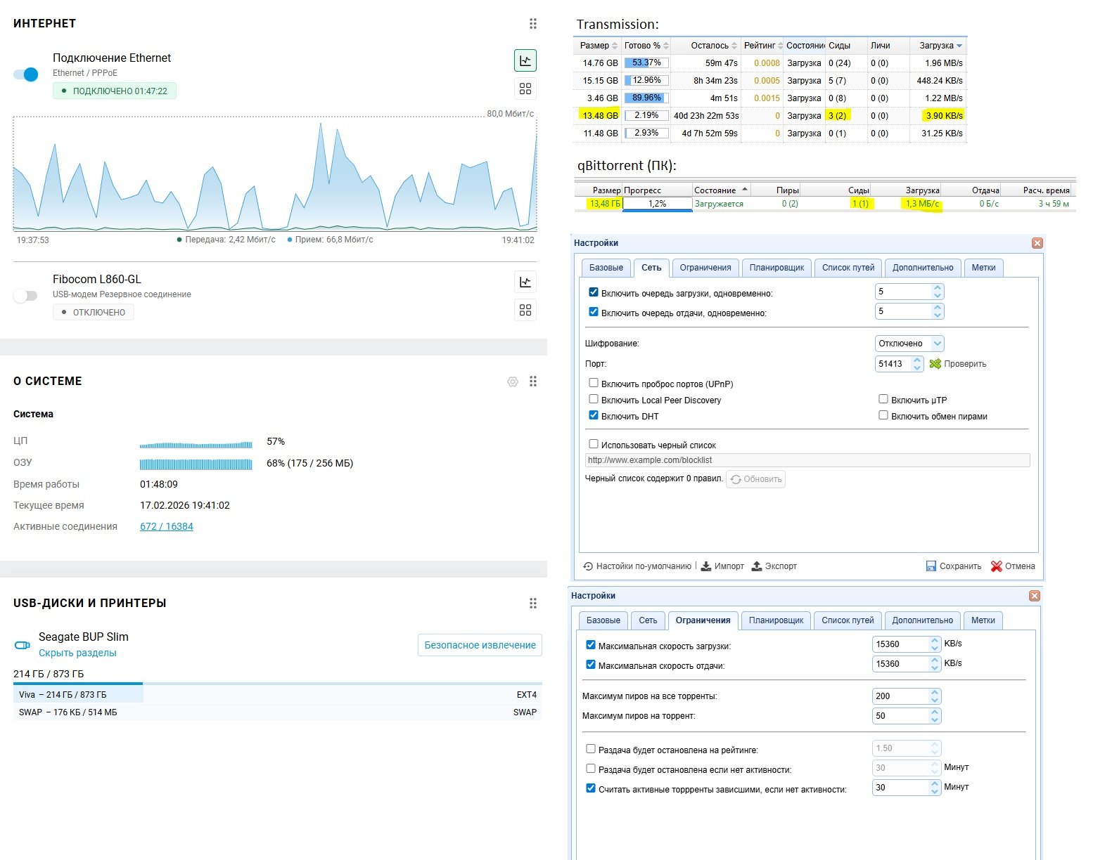 Помимо Transmission запущены DLNA, SMB и WebDAV, но при замерах ими никто не пользовался.