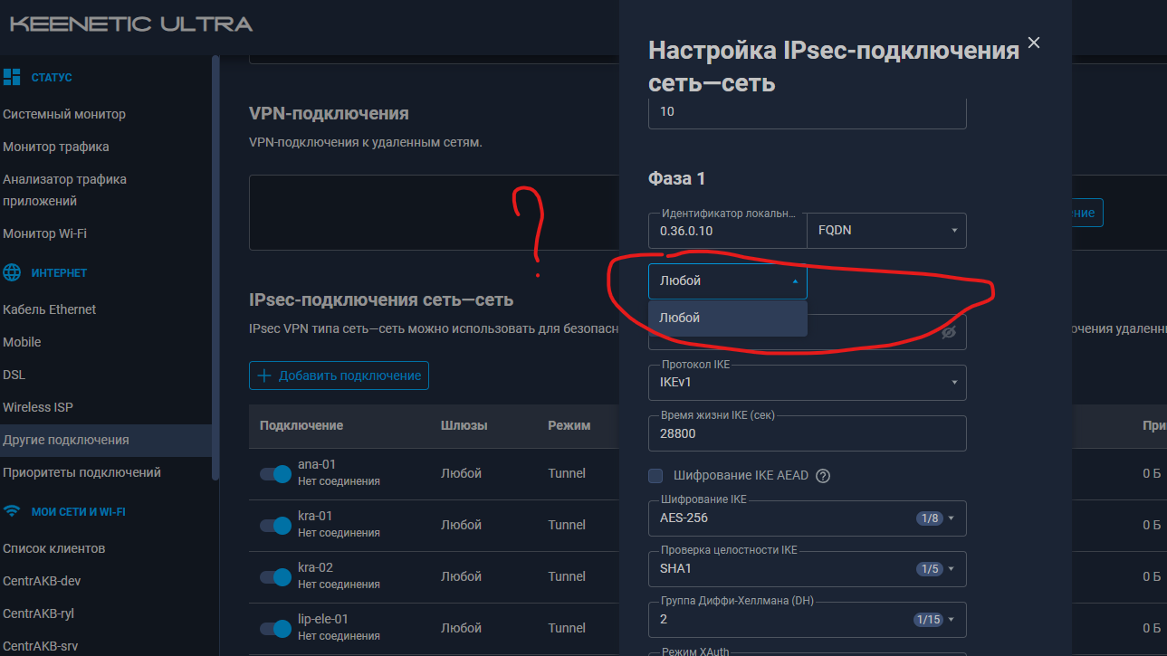 2. Добрый день! Пользуемся вашими замечательными роутерами в фирме, но после обновления с ПО 4.1.7 на любое более новое при создании ipsec туннеля в режиме Ждать подключения пропала возможность выбора и создания ID удаленного шлюза. В новых прошивках в этом разделе стоит слово Любой и нельзя выбрать FQDN, а при режиме Любом у нас из 80 туннелей подключается только один туннель, если первый туннель отключить, то подключается второй, если отключить второй, то подключается третий. Как связаться с тех поддержкой что бы они исправили? Делал эксперимент, сохранял конфигурацию в файл, открывал блокнотом и добавлял в 5 тоннелей в строку match-identity-remote fqdn "какой надо" а по умолчанию в этом поле было any, после этого загрузил конфигурацию в наш Keenetic Ultra и у этих 5 туннелей слетел Ключ PSK, я добавил ключ через web интерфейс, сохранил и 5 туннелей поднялись и стали работать правильно.