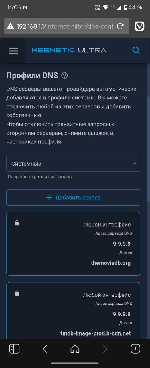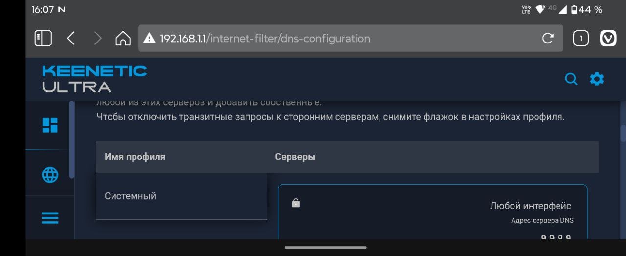 При открытии закладки "Профили DNS" на мобильном устройстве при вертикальной ориентации нет упоминания о статусе Транзита DNS запросов, а при горизонтальном есть.