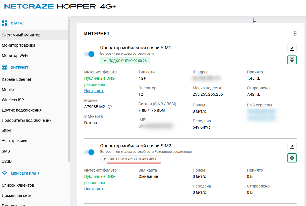Для примера на модели KN-2312 у второго интерфейса статус "Слот SIM-карты неактивен":