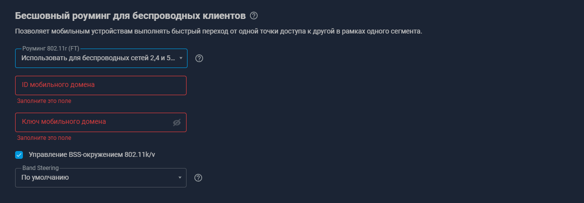 При включении 802.11r придумайте и укажите "ID мобильного домена" и "Ключ мобильного домена". Соответствующие значения этих параметров должны совпадать на всех интернет-центрах локальной сети.