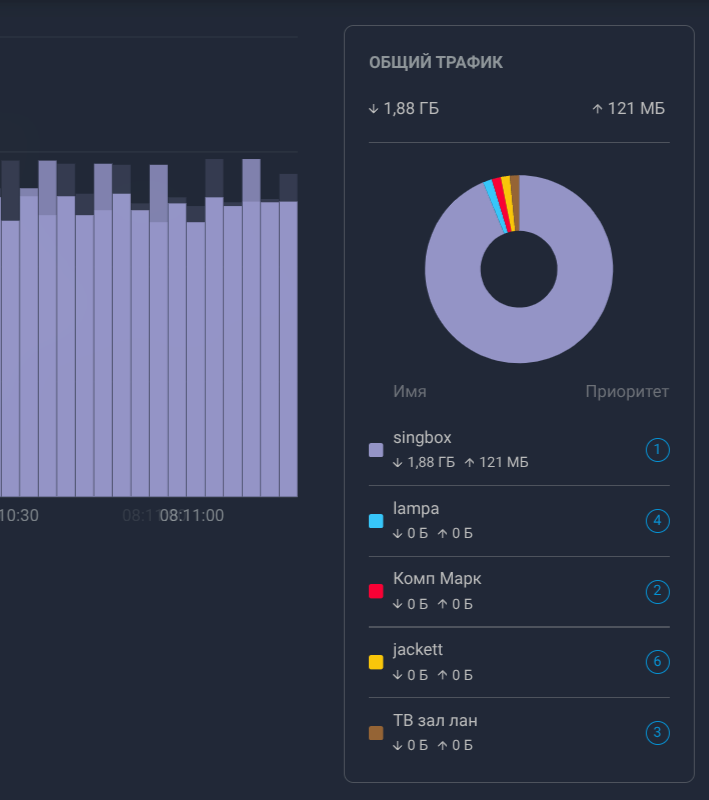 То есть у всех устройств кроме одного единственного нет потока трафика через роутер (все по 0/0 Б), но при этом для них выделяется место в круговом чарте некой величины (видимо это какое-то дефолт значение для 0% - тут я могу ошибаться и это может быть не так).