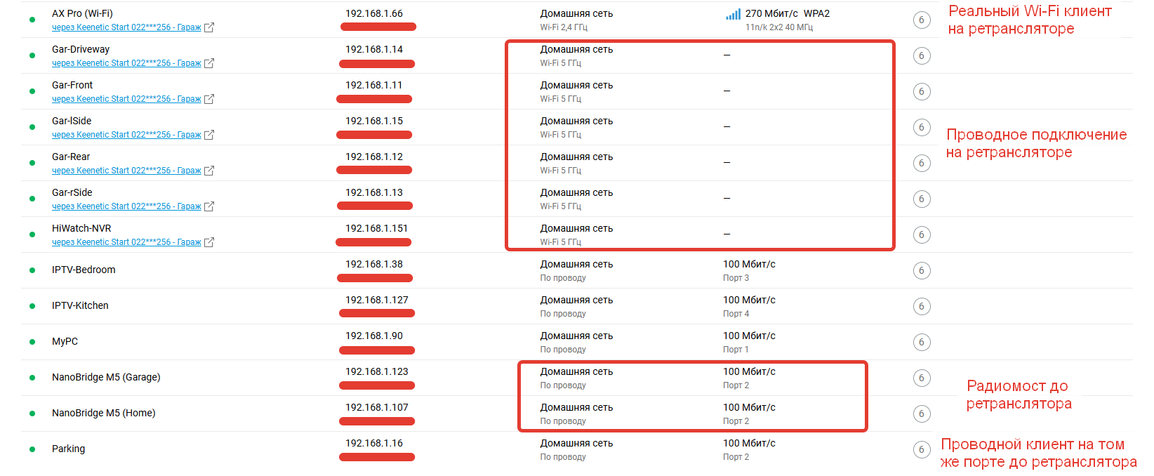 Имеется контроллер Ultra (KN-1810) и ретранслятор Start (KN-1112). В списке клиентов клиенты с ретранслятора определяются, сегмент тоже определяется, но тип подключения не всегда указан корректно, почему-то проводные клиенты с ретранслятора могут быть указаны как клиенты Wi-Fi, при этом в колонке "Подключение" стоит просто прочерк, в это же время в веб-интерфейсе ретранслятора в списке клиентов Wi-Fi некорректно определённые клиенты отсутствуют. Прикладываю скрин для наглядности.