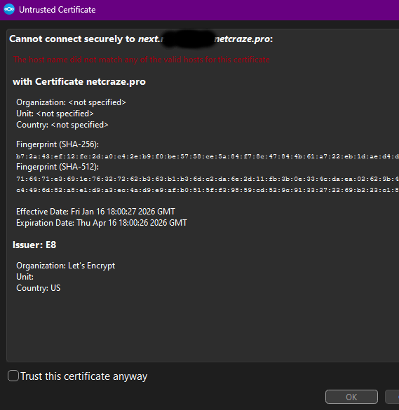 Десктоп клиент nextcloud периодически выдает, не важно на какой машине, Cannot connect securely to nextcloud.DOMAIN.netcraze.pro with cerificate netcraze.pro. То есть по какойто причине сертификат выдан на укороченный адрес, как это исправить?